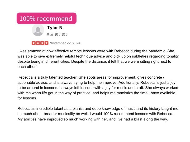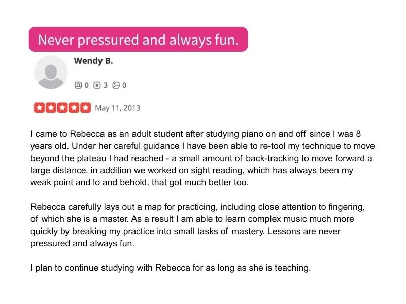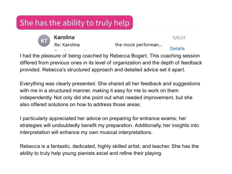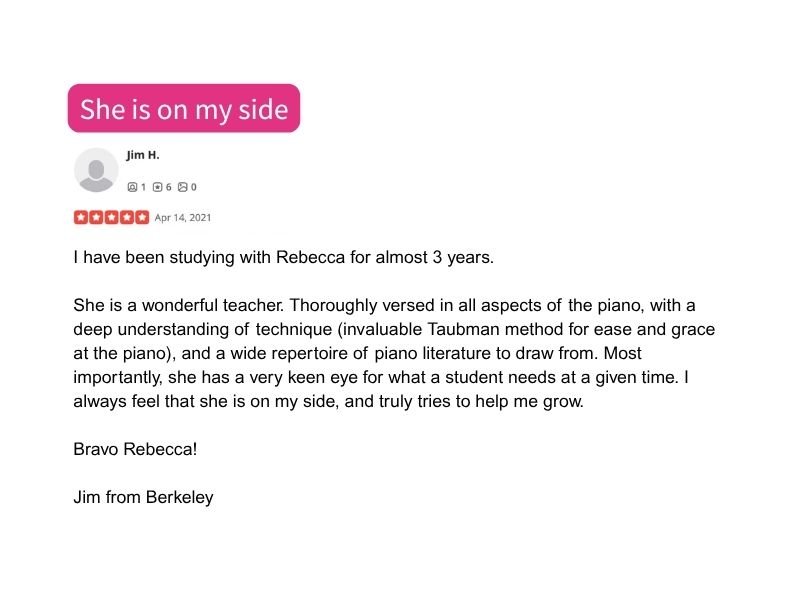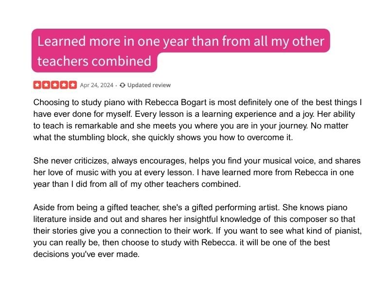 50+ years teaching. Carnegie Hall performance. I rebuilt my technique after an injury through the Taubman Approach. A decade with Dr. Noa Kageyama on performance psychology. Neuroscience based practice methods with Dr. Molly Gebrian.